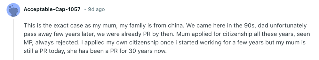 “情况跟我妈妈一模一样,我家来自中国。我们90年代来到这里,不幸的是,爸爸几年后就去世了,那时我们已经是永久居民了。这些年来,妈妈一直申请入籍,也见过议员,但都被拒绝了。我开始工作几年后也申请了入籍,但我妈妈至今仍然是永久居民,她已经拥有永久居民身份30年了。”