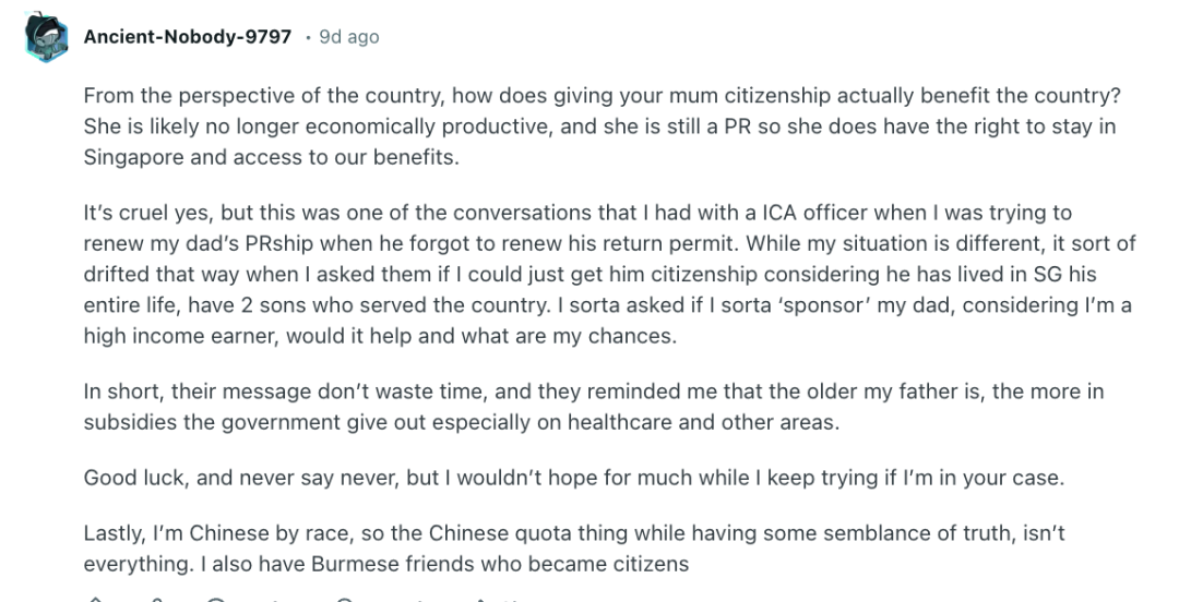 对于楼主的母亲来说,她年纪大了,没有能力再生育新加坡公民子女。从移民与关卡局(ICA)的角度来看,她为什么不在生完孩子后就申请入籍?为什么等到现在?如果她在缅甸没有经济保障,她早就申请了。她的孩子们都已经融入新加坡社会,而她本人也是永久居民。在他们看来,她似乎完全有能力带着孩子们在新加坡安享晚年,无需动用政府福利。因此,她现在申请入籍看起来像是为了获得更多福利而精心策划的举动。”