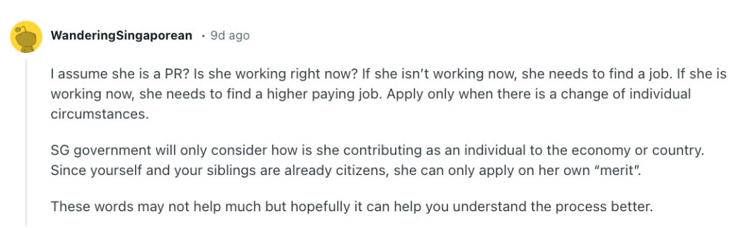 “如果她现在还有在工作,那就尽量去找一份薪水更高的工作。只有在个人情况发生变化的时候,再去重新申请会比较有机会。新加坡政府主要看的是:她作为“一个独立个体”,对国家和经济能带来什么贡献。因为你和你的姐妹已经是新加坡公民了,所以在申请时,你们基本不会再被算作她的加分条件。她只能靠自己的“条件”和“实力”来申请。”