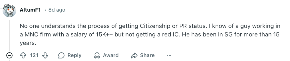 “我认识一个人,在一家跨国公司工作,月薪1.5万新元以上,却一直没拿到新加坡公民身份。他在新加坡已经超过15年了。”