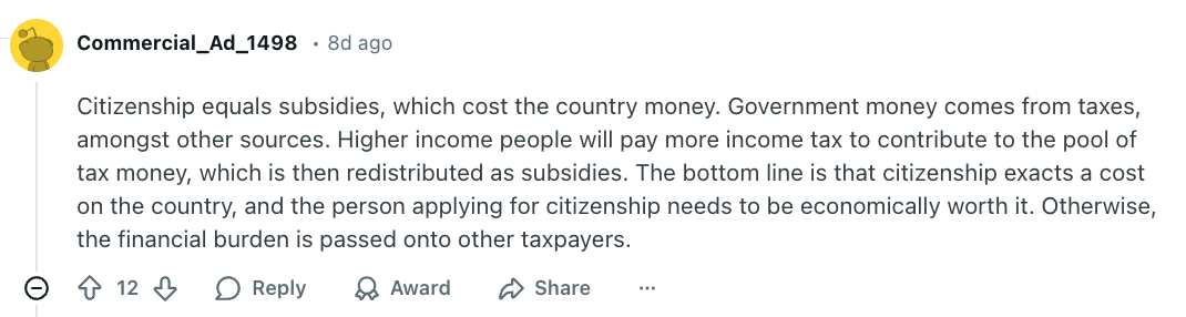 “公民身份意味着补贴,而补贴会消耗国家资金。政府资金来源包括税收等。高收入人群缴纳更多所得税,从而增加税收总额,这些税收最终会以补贴的形式重新分配。归根结底,公民身份会给国家带来成本,申请公民身份的人必须具备一定的经济价值。否则,这笔财政负担就会转嫁到其他纳税人身上。”
