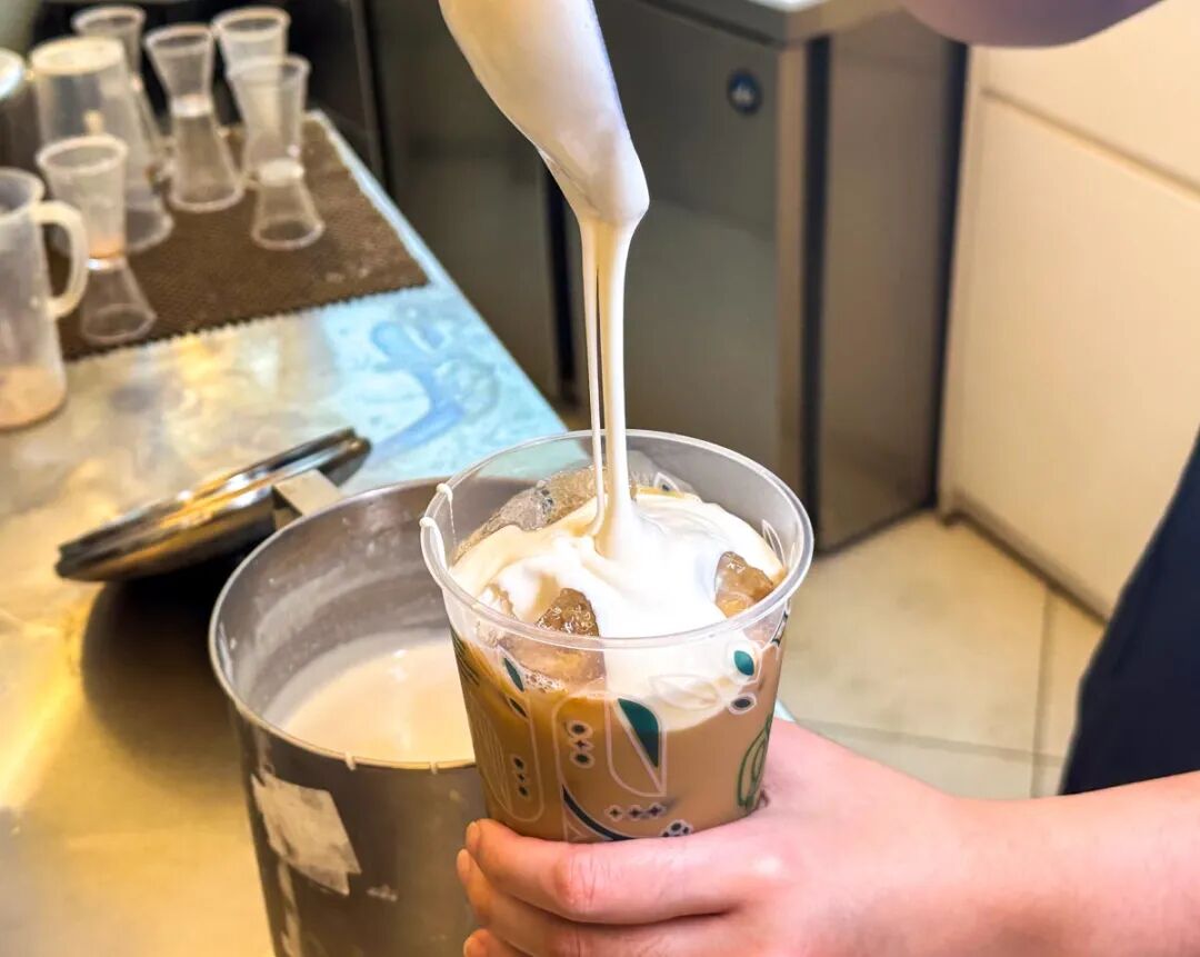 其用进口北海道牛奶制饮,提供自研混合豆及月换单品豆,黑咖啡、白咖啡品类丰富,白咖啡还可加调味。