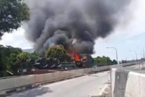 当时的场景:重型车辆翻落高架桥后车轮朝天,车头的部分正在起火燃烧,夹杂着浓烟的火势相当吓人。