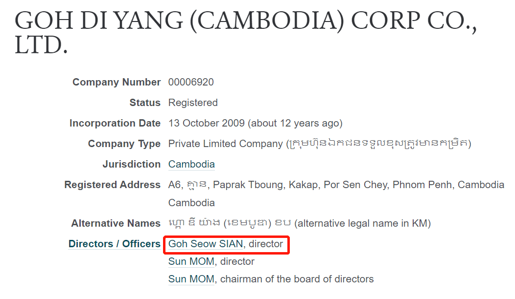 而根据柬埔寨方面的商业记录,Goh的注册地址是盛港的一个公寓。