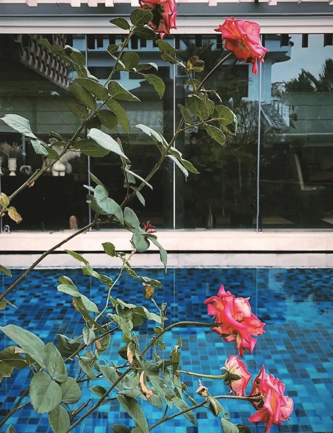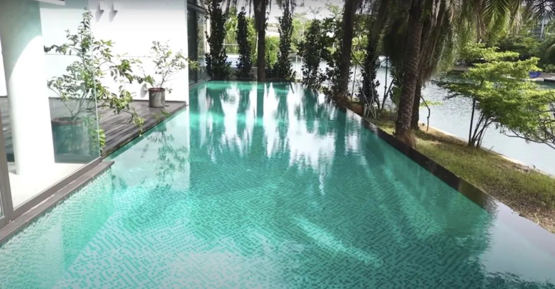 从照片来看,泳池周围都是落地窗。↓