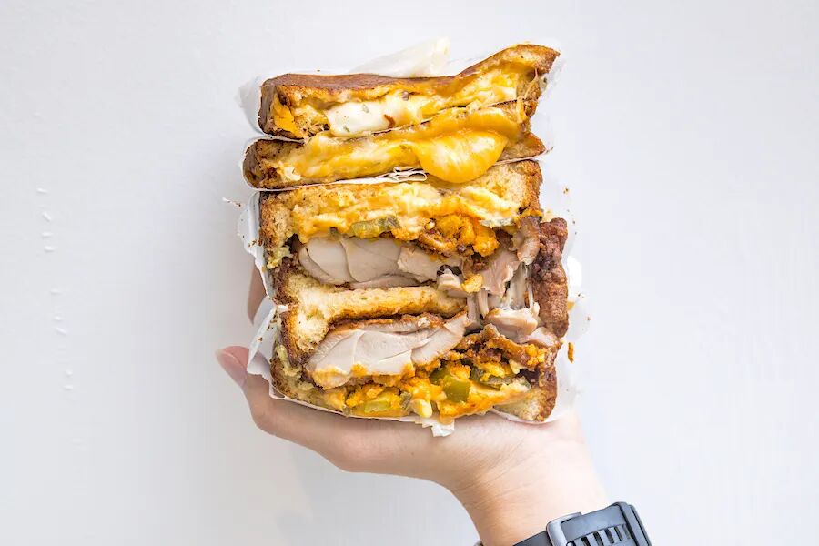 Breakfast Grill 的三明治因量大料足受欢迎,13 新元的Cheeses用五种奶酪,16 新元的 Hot Chick 等,最贵的 24 新元 1-800-SURF-N-TURF 有和牛虾饼。