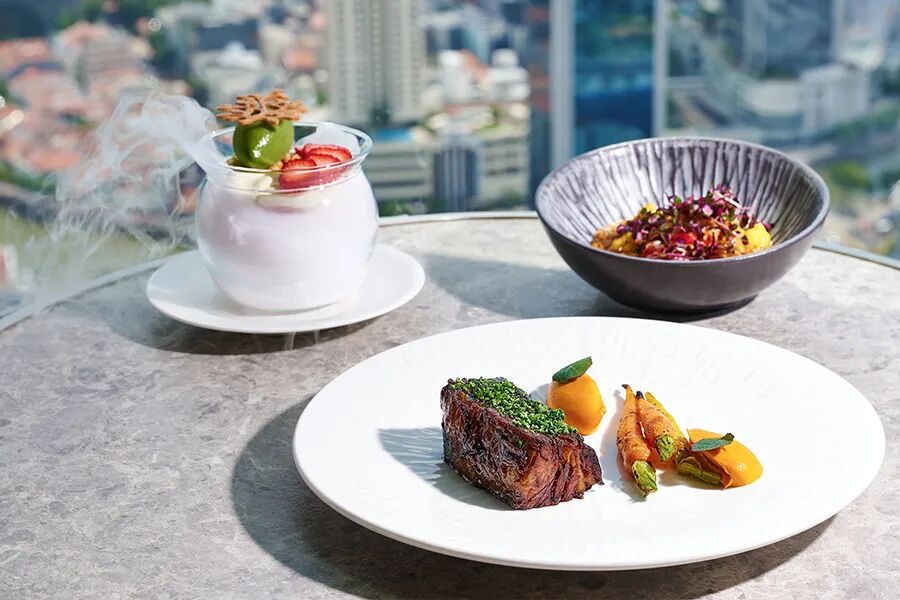 Spago 金沙 57 层高空餐厅,视野无敌,高空用餐体验直接拉满!加州料理出品精致,午市 S$65、晚市S$88 3 道式套餐,招牌菜不仅摆盘惊艳,而且味道也在线。