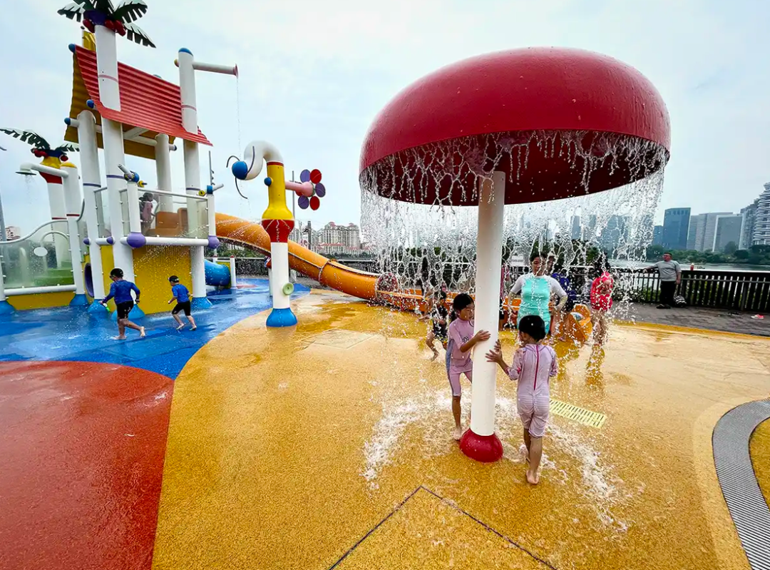 这里分四大区域,水柱隧道、水花角落、喷泉区趣味十足,还有专属浅水池适配幼童,清凉又好逛!