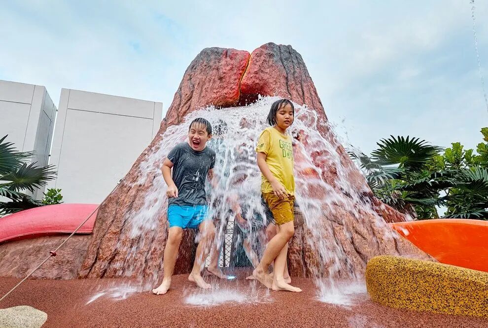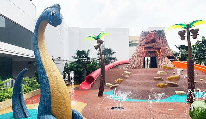 Causeway Point Water Playground,这里有翼龙、雷龙等恐龙造型,火山会喷水还能夜间亮灯模拟喷发,两侧分干湿滑道,还有化石探秘、史前拍照点及乐器互动,超适合小朋友。