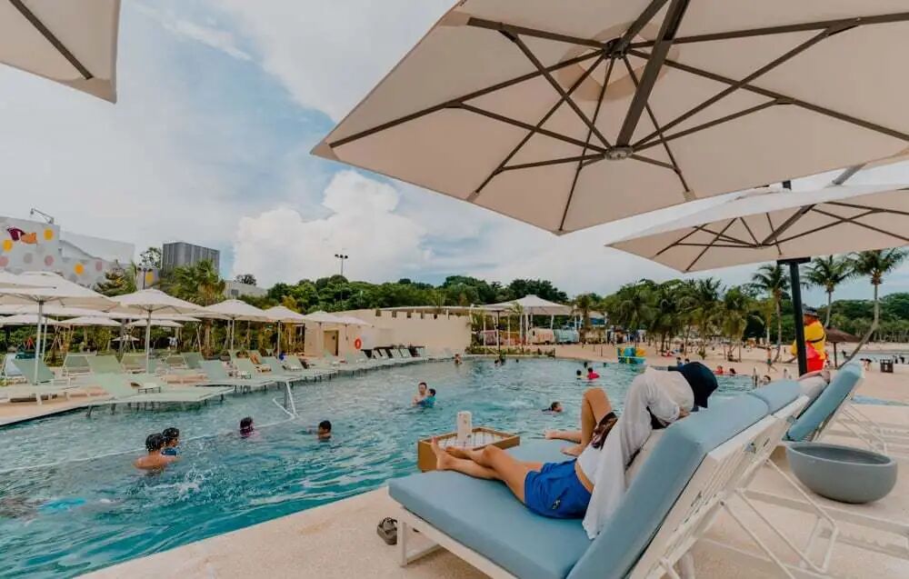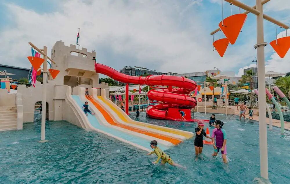 圣淘沙 Splash Tribe Beach Club 紧跟高端潮流,全家都能嗨!沙堡主题水上游乐场有环形管滑梯、竞速滑道 + 水枪互动,1.2 米无边泳池赏海景,还有日光床、凉亭,可边休闲边看娃。