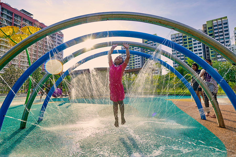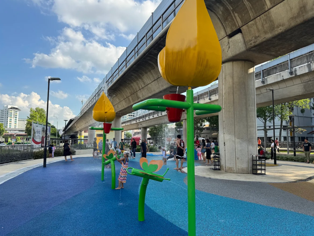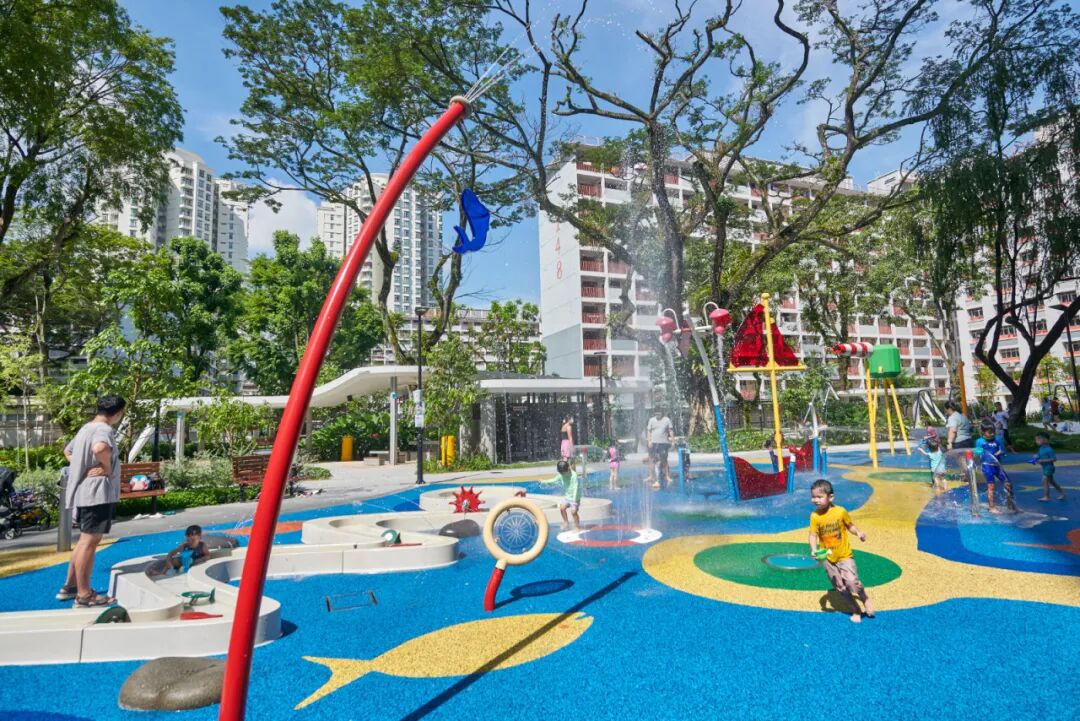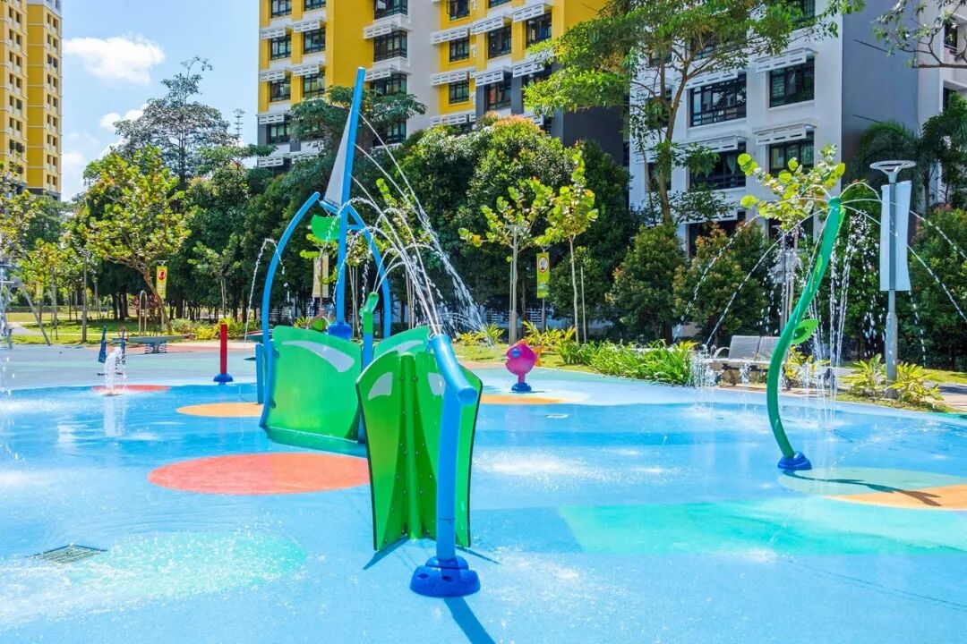 2022 年 4 月开业的 Play @ Heights Park at Toa Payoh 超吸睛!色彩斑斓的地板印着鱼类图案,孩子能在小倾倒桶下等惊喜泼水,玩转带水车的小溪、迷你浅水池和洒水器,旁边还有开放式淋浴隔间,玩水后冲洗超方便。