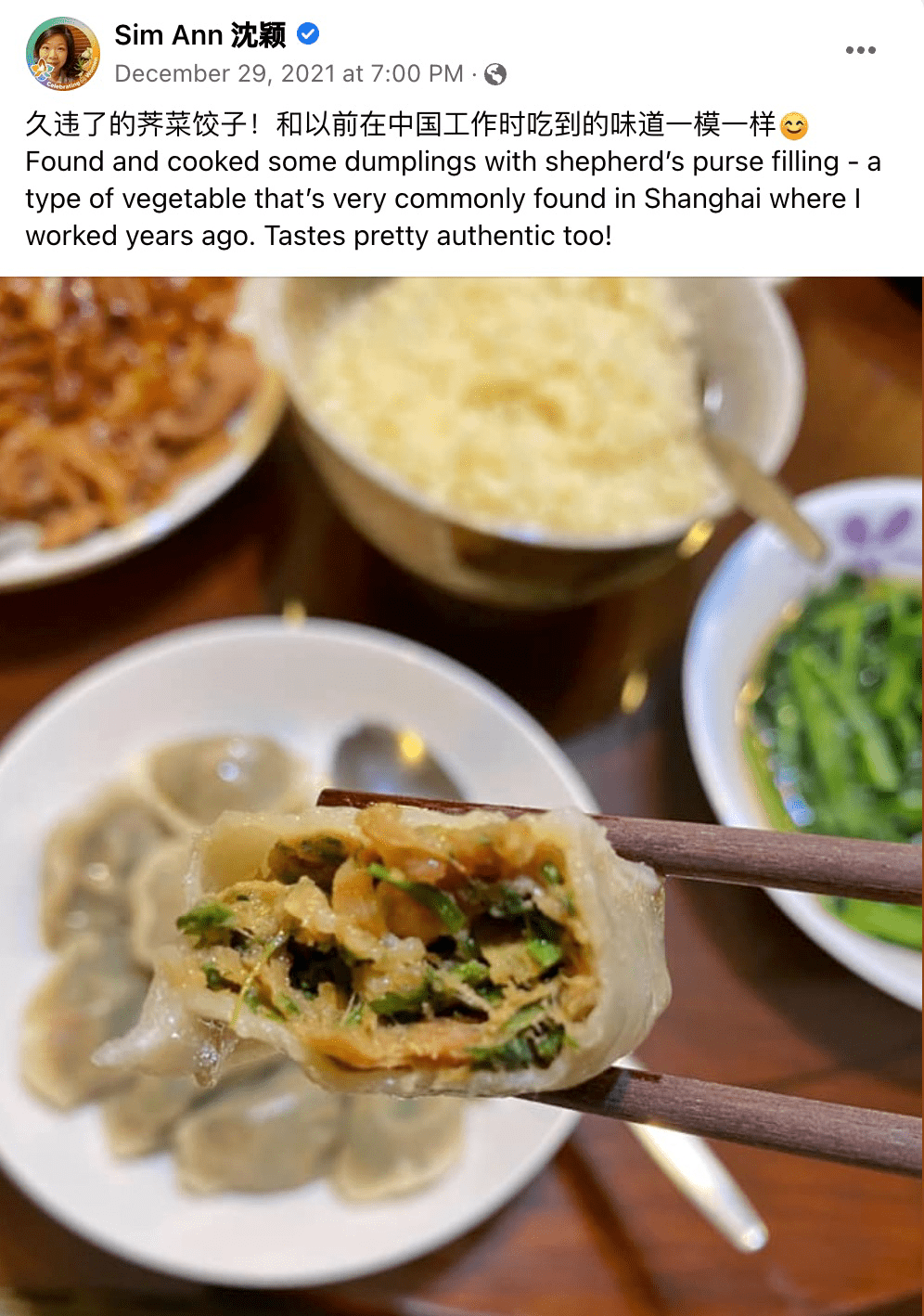 就连新加坡的外交部政务部长沈颖,前两天也晒出吃饺子的照片。
