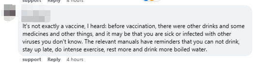 还有网友觉得,这种情况也不全跟打疫苗有关。如果打疫苗前,服用了其他饮料或吃了一些药也是有可能的。