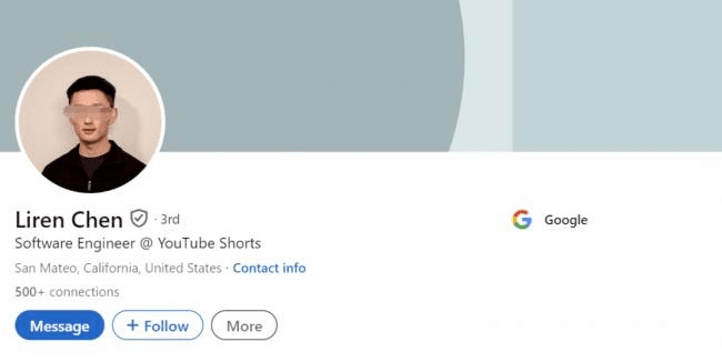 Liren Chen(丈夫)34岁,本科清华,硕士就读圣地牙哥加利福尼亚大学分校(UCSD)计算机科学专业,就职过图灵,在2020年3月入职谷歌,担任软件工程师。