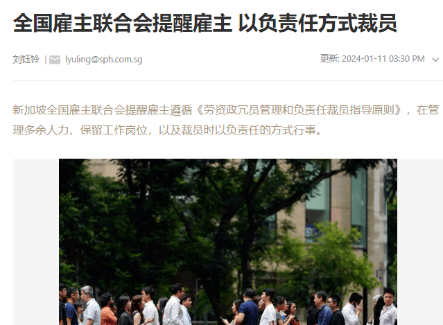 1月11日时,新加坡全国雇主联合会指出本地去年裁员人数和裁员率有所增加,各企业重组是导致裁员人数增加的主要原因。