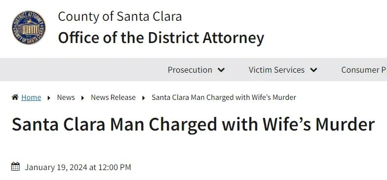 上述这则谷歌华人夫妻家暴谋杀案被证实地点是在Santa Clara市。男方被重罪起诉,审判日期推迟至1月24日。