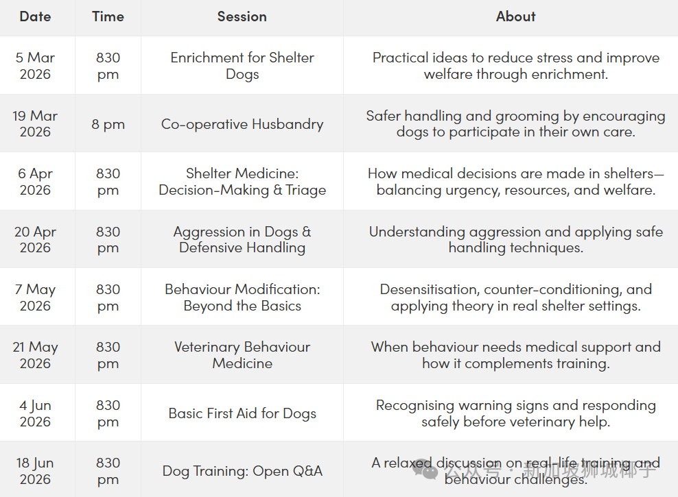 系列共 8 节晚间课程,面向志愿者、寄养家庭及救助人员,由专业人士讲解犬只减压、安全接触、行为矫正与兽医护理等知识,课程免费,欢迎捐助。