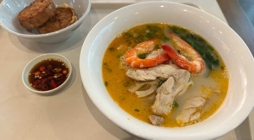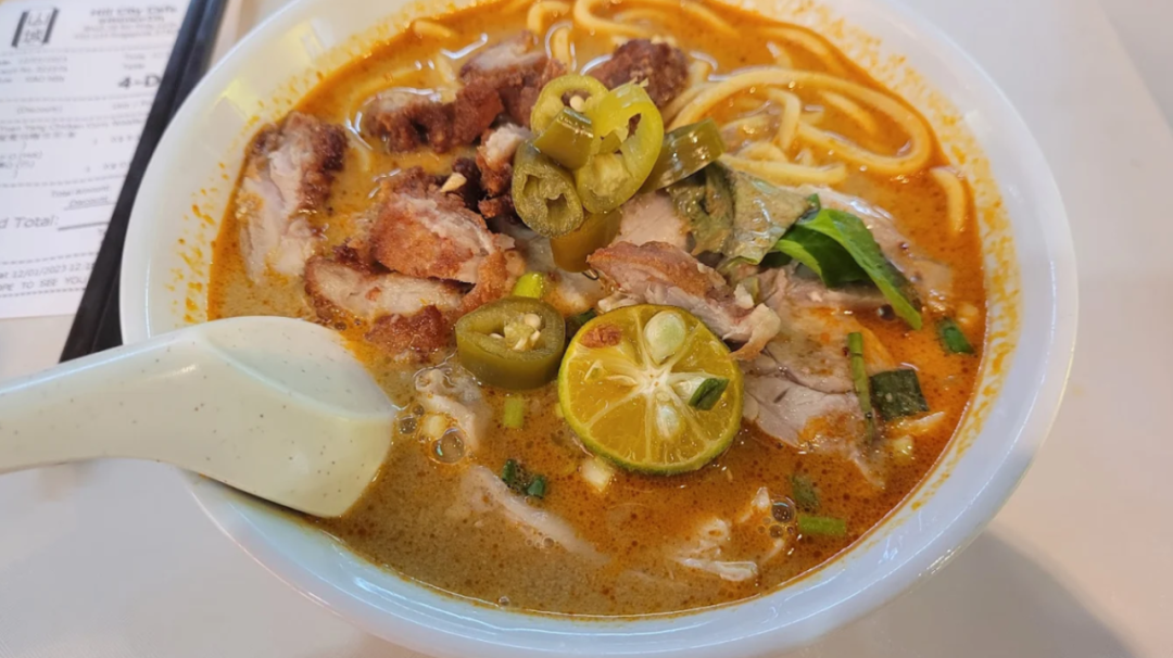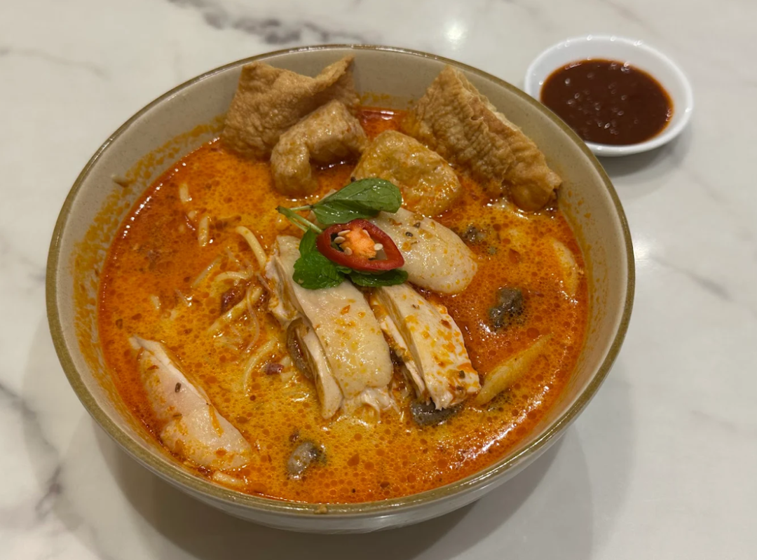 作为国际品牌,其菜单含 roti canai 等经典菜品,Penang Assam Laksa 售 12.90 新元,酸甜辣交织,汤底带姜花薄荷香,含新鲜马鲛鱼块。