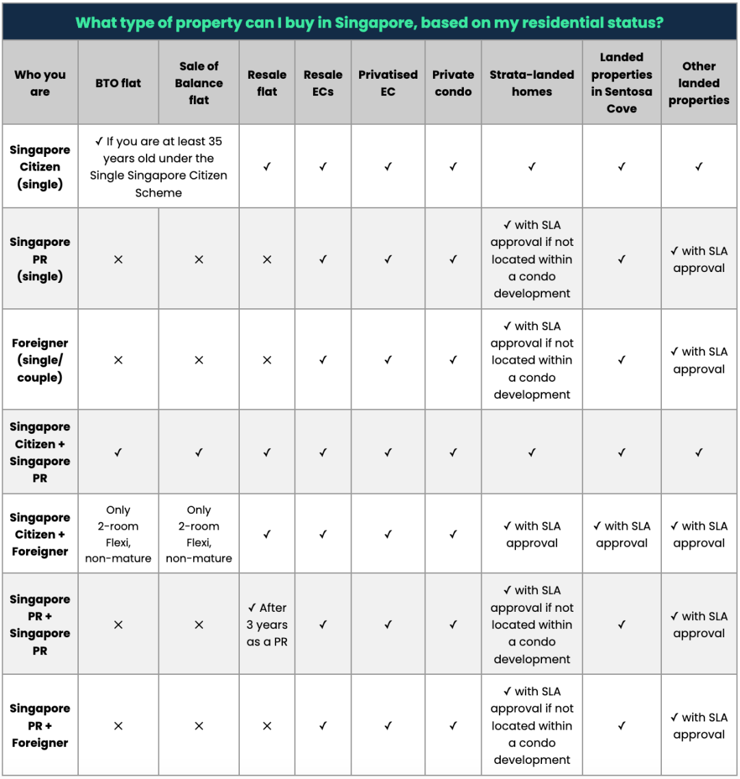 购买私人房产:二手执行共管公寓(EC)、私有化EC(满10年MOP)、私人公寓、分层地契有地住宅(拥有房屋产权但不含土地产权)、圣淘沙升涛湾有地房产、以及经土地管理局批准的有地住宅