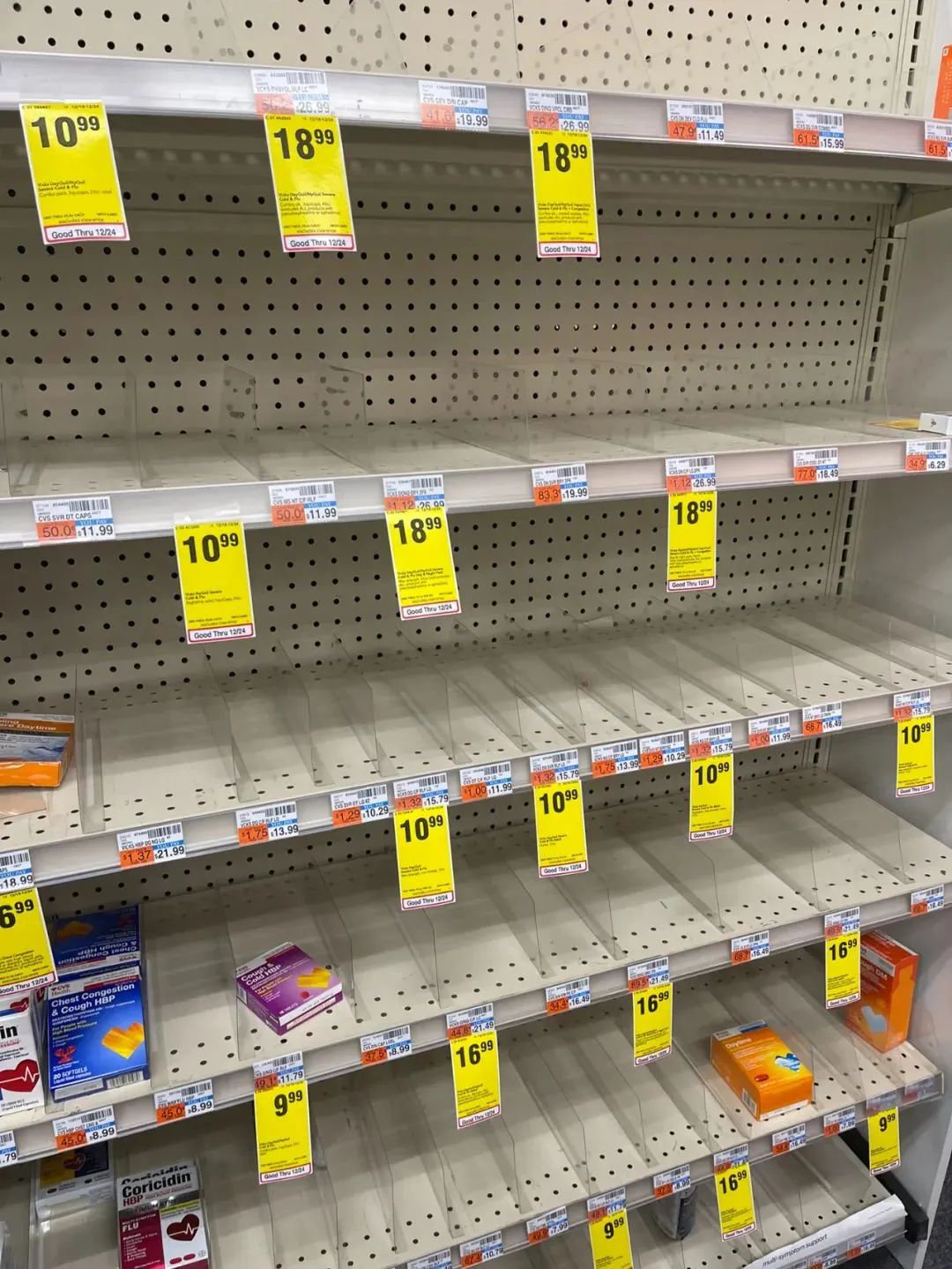 网友实拍药房的退烧药、感冒药、止咳药,维生素C等货架几乎全空。↓