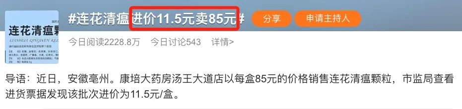 一盒连花清瘟颗粒,进价11.5元,有药店竟然公开标价一盒卖85元(约合16.4新元)!↓