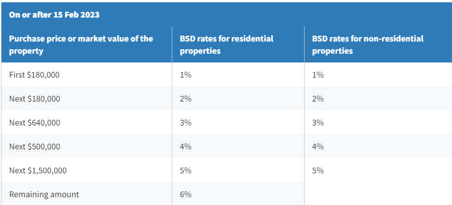 ②买方印花税BSD:按出售的产权份额价值计算。例如,房屋价值100万新元,丈夫将50%份额卖给妻子,则买方印花税按 50 万新元计算。新加坡税务局会以实际支付金额或房屋市场价值中较高者作为参考。目前新加坡BSD的税率如下: