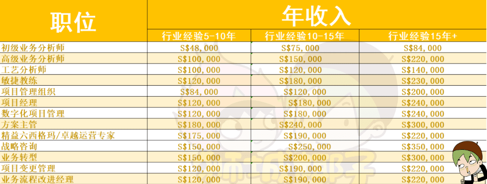 初级业务分析师,工作5-10年平均年薪收入中位数为4.8万新元,10-15年为7.5万新,15年以上经验为8.4万新。(更多职位及年薪详情见下表)