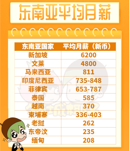 泰国的平均月薪不到600新币,而越南、柬埔寨只有3百多新币,老挝、东帝汶、缅甸甚至只有2百新币。