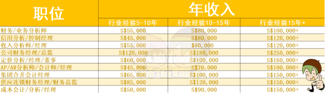 财务/分析师,工作5-10年平均收入中位数为55000新币,10-15年经验为8万新币,15年以上经验为10万新币。(更多职位及年薪详情见下表)