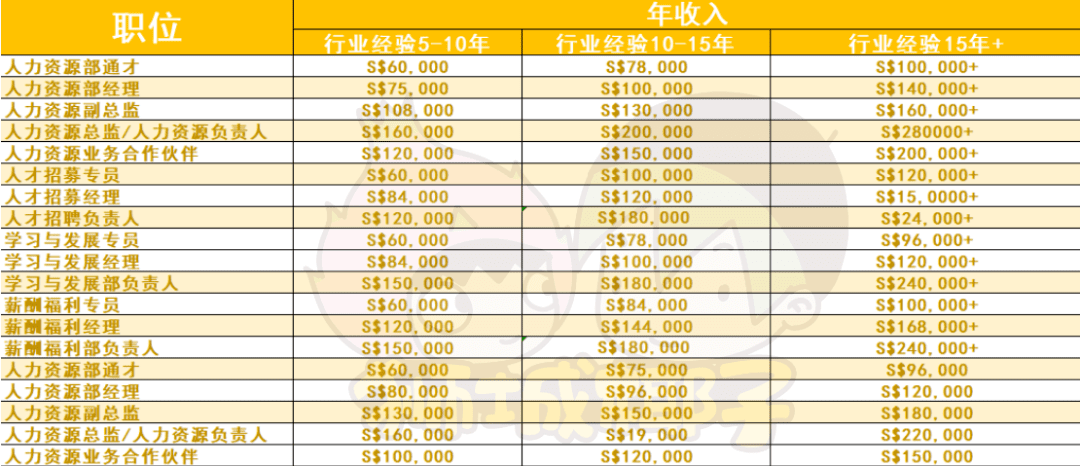 人力部经理,工作5-10年平均年薪收入中位数为75000新元,10-15年为10万新,15年以上经验为14万新。(更多职位及年薪详情见下表)