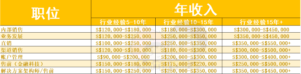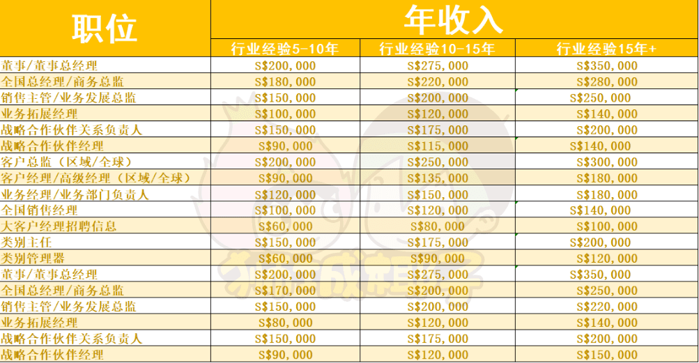 销售主管,工作5-10年平均年薪收入中位数为15万新元,10-15年为20万新,15年以上经验为25万新。(更多职位及年薪详情见下表)