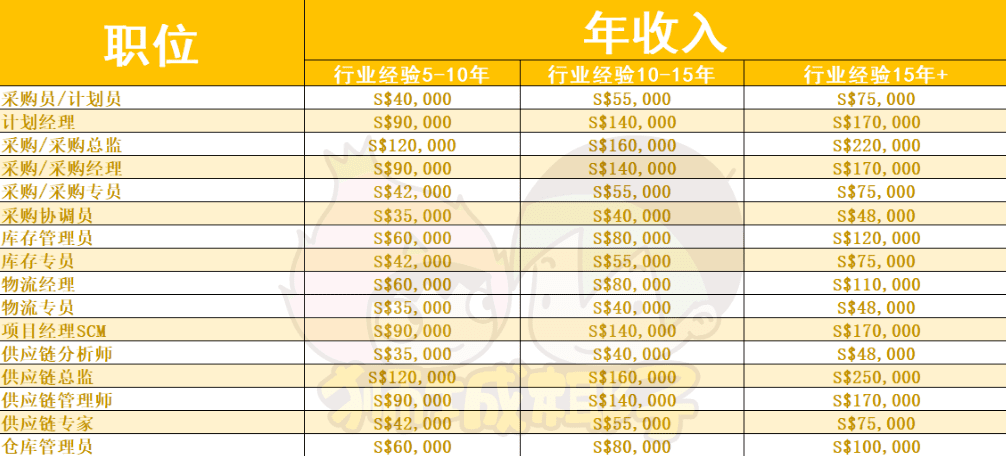 采购员,工作5-10年平均年薪收入中位数为4万新元,10-15年为5.5万新,15年以上经验为7.514万新。(更多职位及年薪详情见下表)