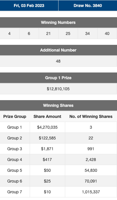 中奖号码是4、6、21、25、34和40,额外号码是48。头奖高达1281万新,最终被3名幸运儿分走了,每人均分427万新多!