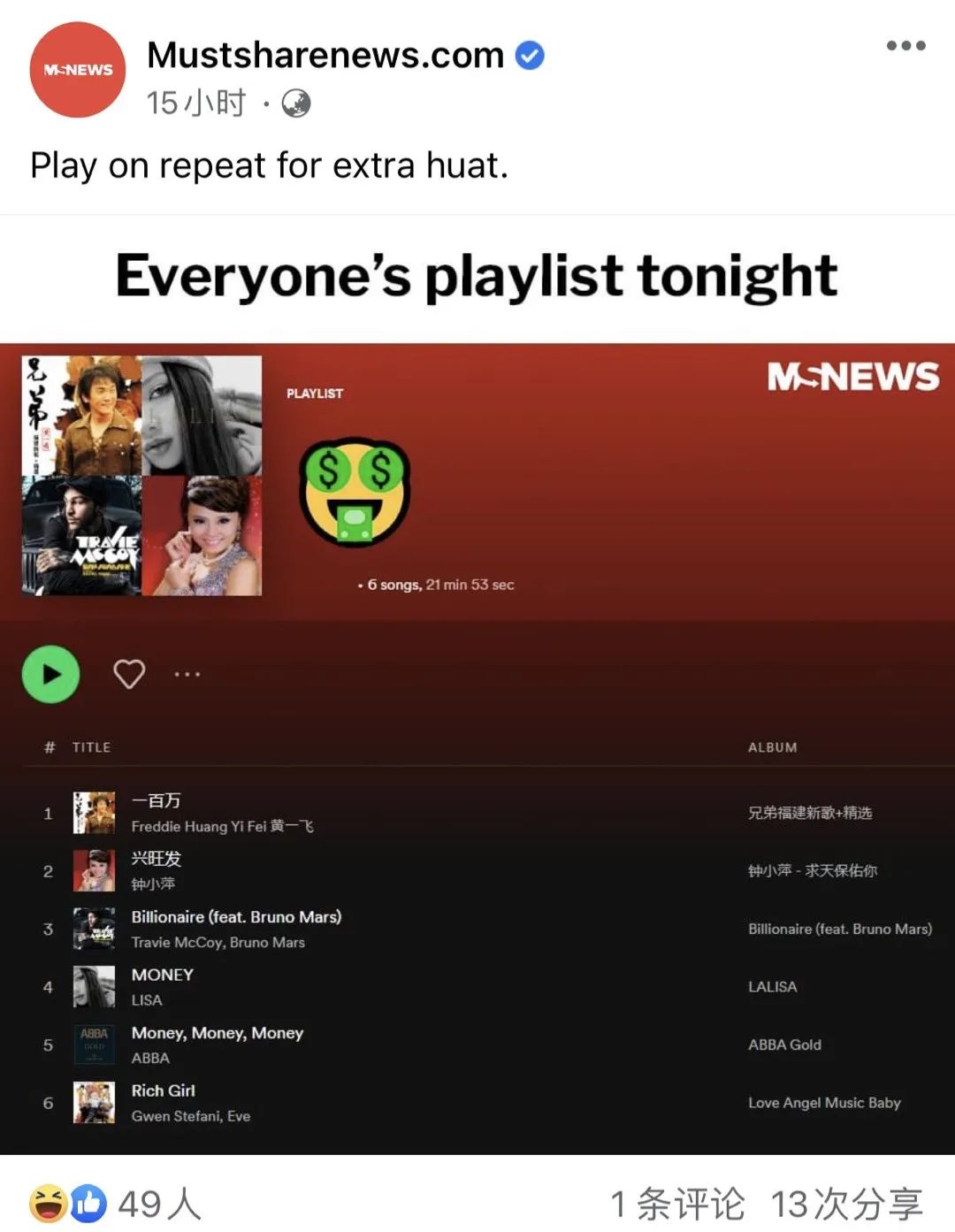 本地媒体更是应时地送上了一份“发财歌单”,歌单列表极其多元国际,各类中英语歌曲都有!
