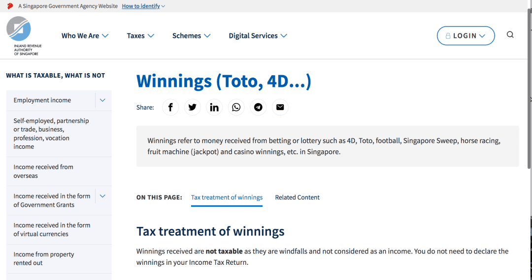 新加坡的税务官网上标注了TOTO中奖所得不缴税。