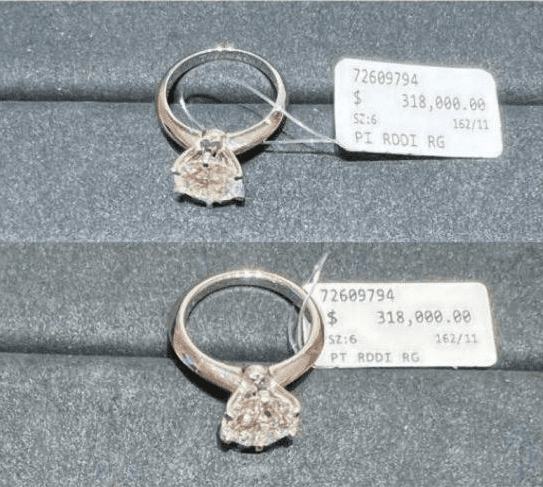 当天中午12点45分,吴某抵达珠宝店后,向另一位店员要求要看那枚3.18克拉的钻戒。他拿着该钻戒的同时又要求看其他的钻戒,以此分散店员的注意力。