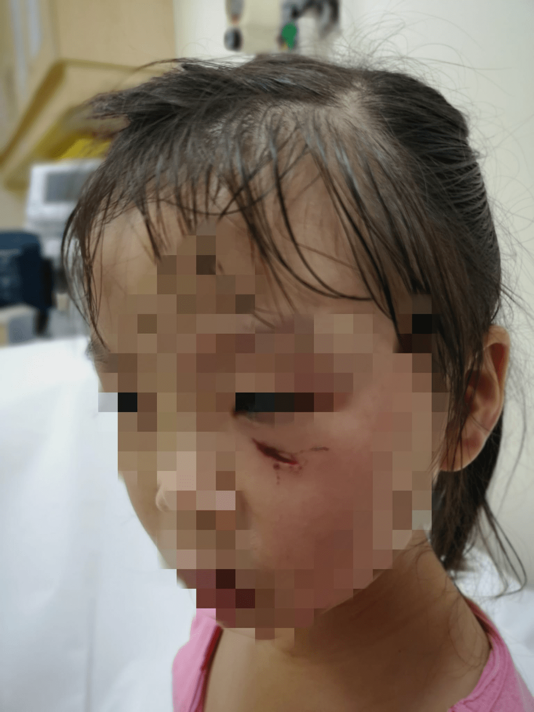 可以看到,女孩的脸上有一道深深的伤口,血一直止不住,有破相的可能。