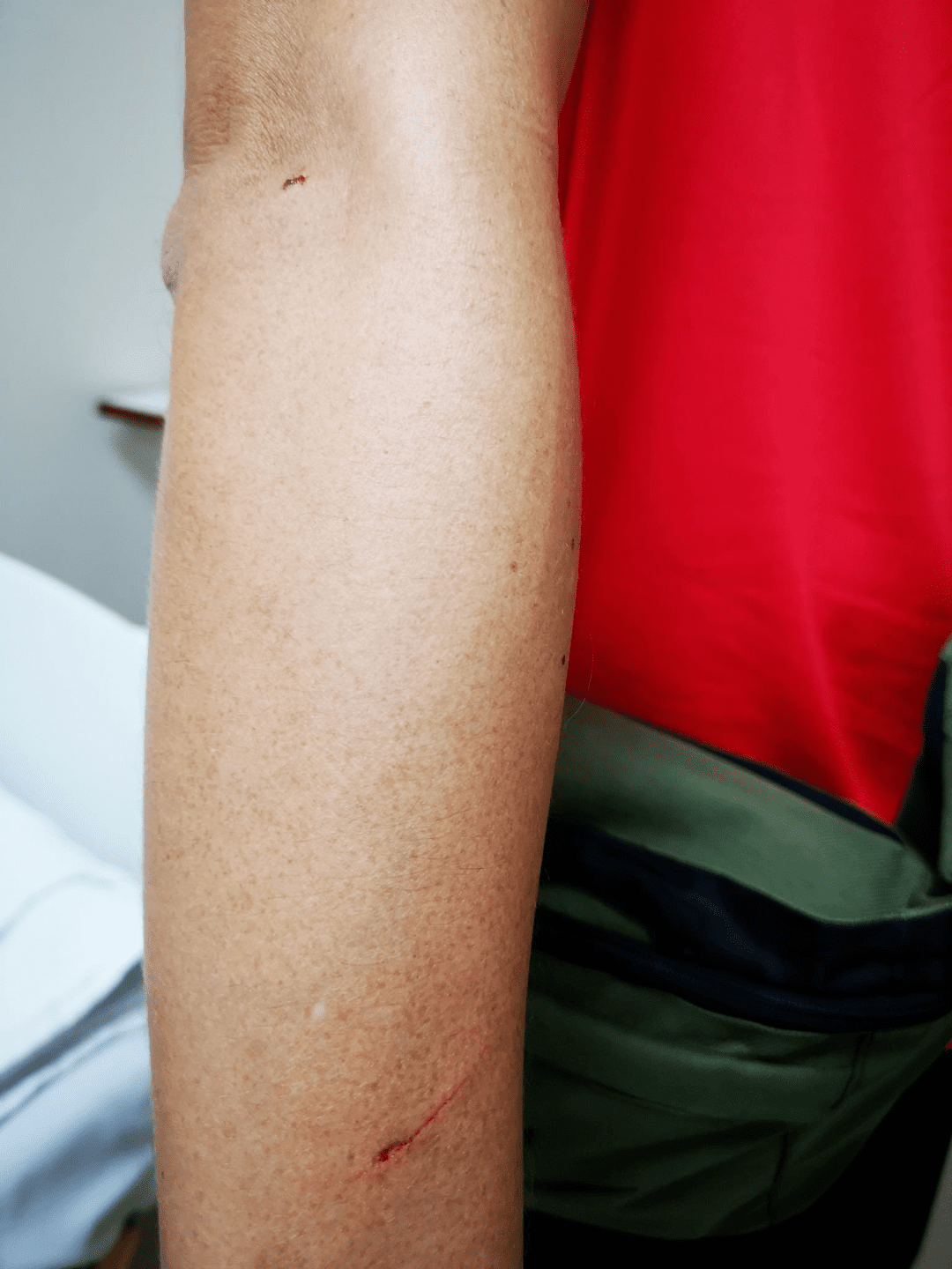 不仅如此,女孩的父亲想要保护小女孩时也遭到孔雀的攻击。父亲在孔雀的攻击下摔倒,手肘上留下了擦伤和数道抓痕。