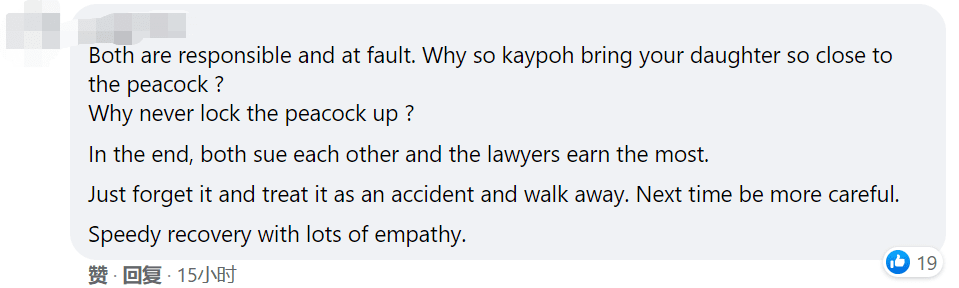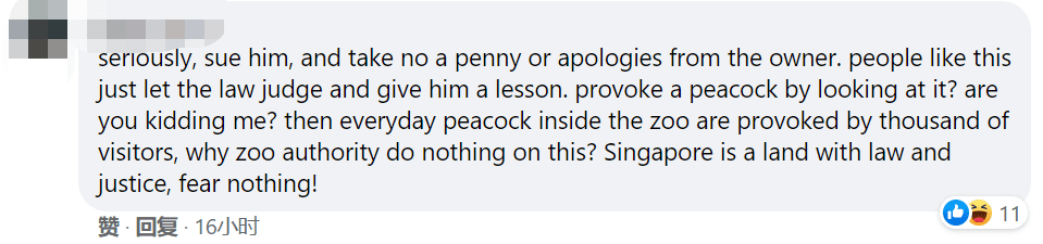 “说真的,起诉他(孔雀主人)就对了,别接受他的道歉或是赔偿。像这样的人应该让法律审判并给他一个教训。盯着孔雀看就会激怒它?你在跟我开玩笑吗?动物园内的孔雀每天都被成千上万的游客挑逗,为什么动物园对此无动于衷?新加坡是法律和正义之地,别害怕!”