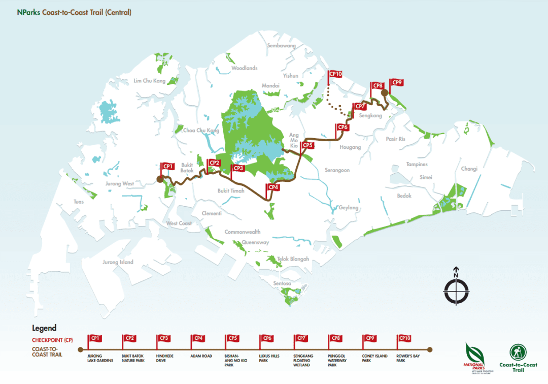 中央步道起点为西部的裕廊湖花园,终点是东北部的榜鹅海岸一带的科尼岛,如果步行走完全程,根据谷歌地图需要11个小时左右。