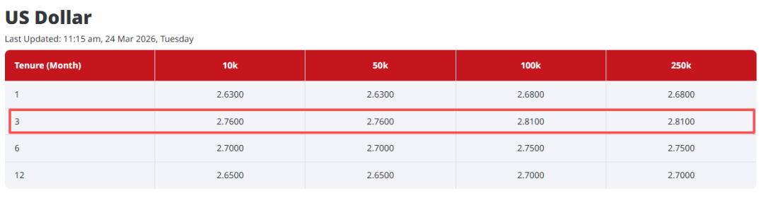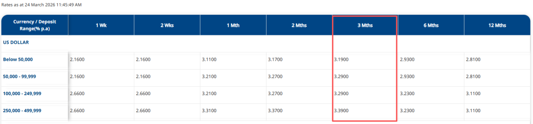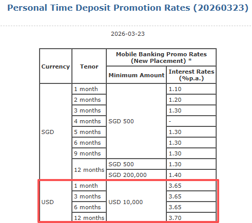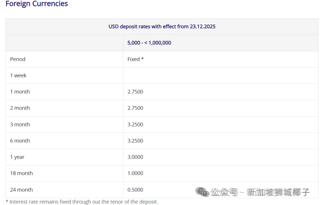 如果你厌倦了新元定存的低利率,又愿意承担一部分美元定存波动的风险(一些银行提供的美元定存利率不会在存期内保持一致),可以看看下面这份情报~