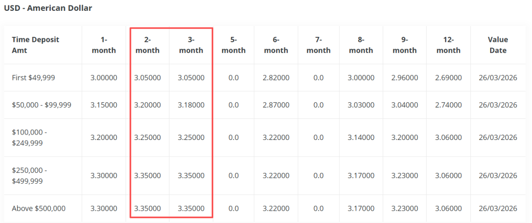 OCBC华侨银行的美元定存是本月涨幅最高的。这个月存2/3个月能拿到的3.35%的利息(比上月更高),但必须存够25万美元才能享受。