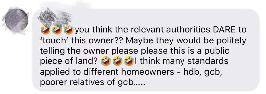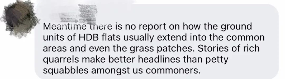 从来没有任何组屋单位的一楼单位占有公共区域或者草地的报道出来啊!可见富人之间的争吵都比我们平民的小吵闹来得有看头呢?!