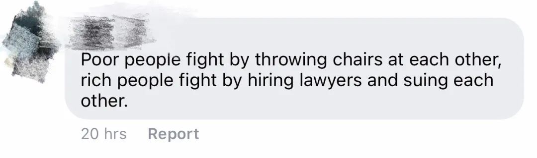 "穷人之间的吵架是互相丢椅子小儿科。而富豪之间就是互相雇用律师进行打官司咯!"