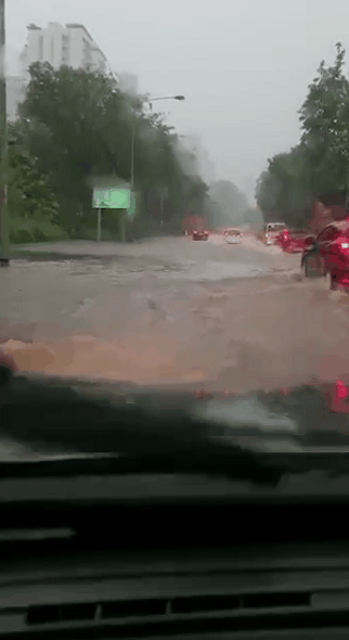 随后,厚实的海啸云变成了特大暴雨,道路积水严重 ,很快就到了大腿的高度!