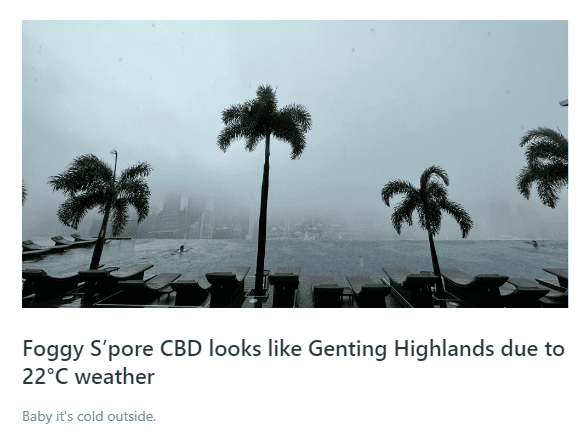 可能20多度,在目前真正在过冬的中国网友眼中不算什么,但是在热带国家新加坡,却真的不是年年都会经历的事。(加上下雨更是有双重寒冷debuff)