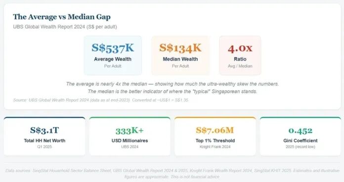 不要让那些关于“新加坡家庭平均净资产200万新元”的新闻标题让你感到自卑。那个数字被超级富豪严重拉高了,而且其中一半还是无法流动的房产。
