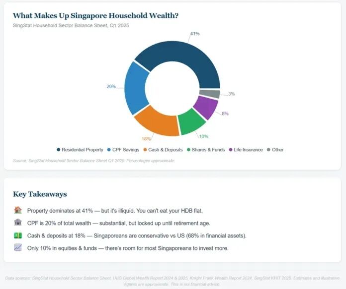 根据新加坡统计局的家庭资产负债表(2025年第一季度),以下是新加坡家庭财富的大致构成:
