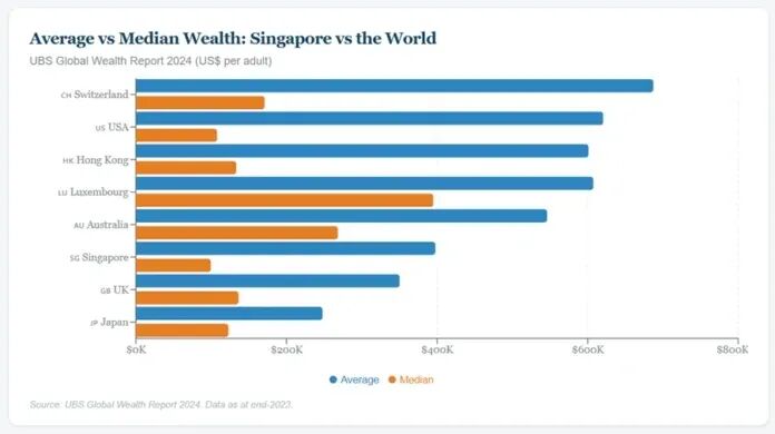 这与同一报告中成年人平均财富397708美元(53.7万新元)相比,差距显著。下图直观展示了这一差距——平均财富几乎是中位数的4倍。