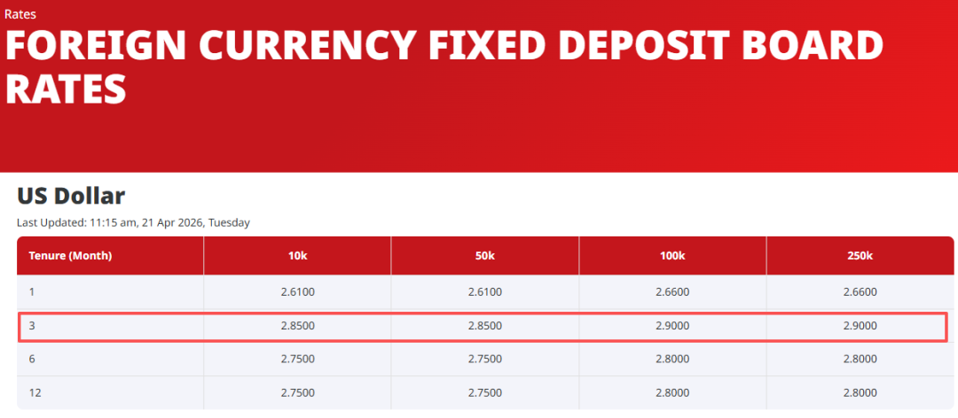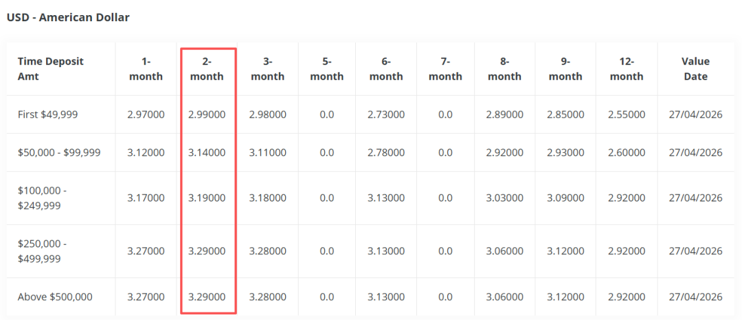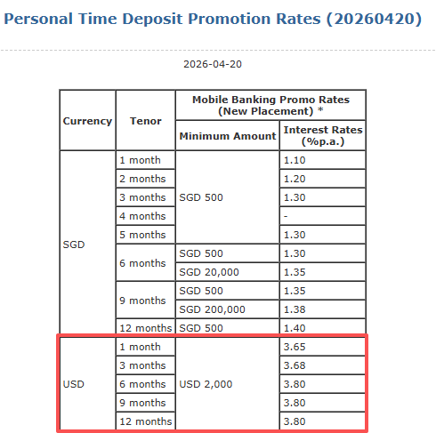和UOB一样,OCBC华侨银行的美元定存也下降了。